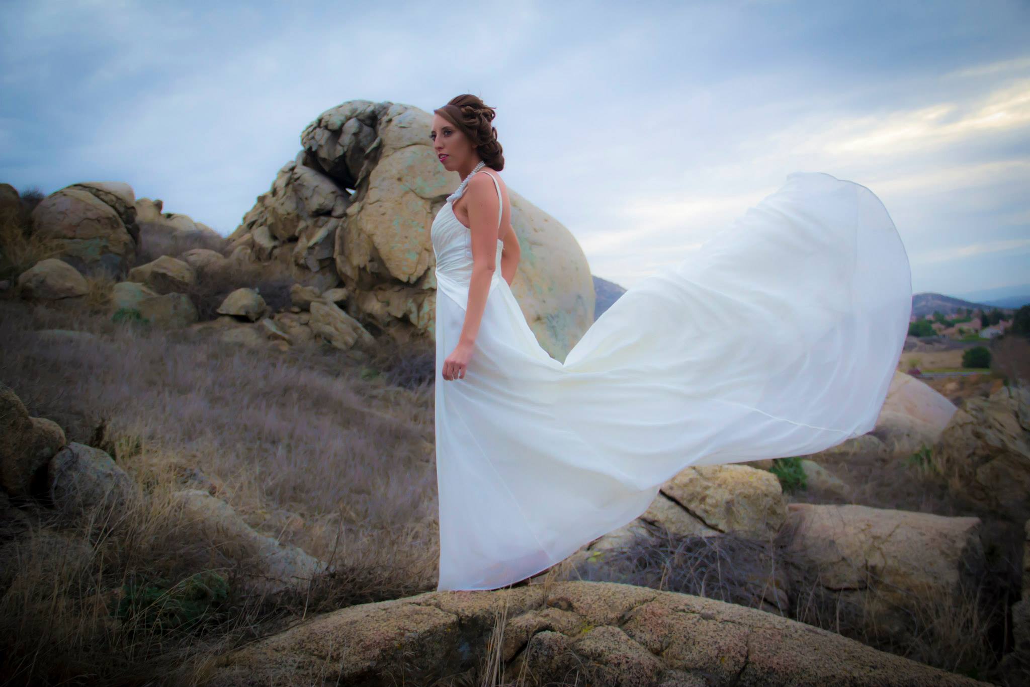 Just keep in mind, I was very sore this day, because I just did a Spartan Sprint and I was really sore! 4.5 mile run, 20 difficult obstacles, and this is for another story to tell. For the location, I choose a hill by Moreno Valley, CA. and it wasn’t that easy to get up there, because their was no trail, the hill has a slight incline, the rocks are not climb friendly, and those bushes are spikey! I definitely give all the crew brownie points for actually allowing themselves to go through all those obstacles. Plus the weather didn’t help either. I noticed the clouds started getting dark and all of a sudden it started drizzling. I was worried for the photographers camera, but he kept on shooting. I must say that the change of weather added a beautiful effect for the shoot. Hope you guys love our collaborated work.